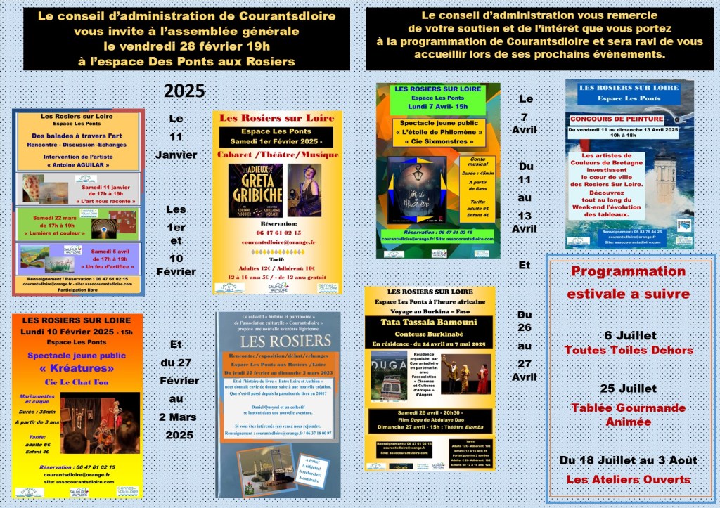 Moins de 12 ans gratuit Réservation : 06 47 61 02 15 courantsdloire@orange.fr. Site: assocourantsdloire.com