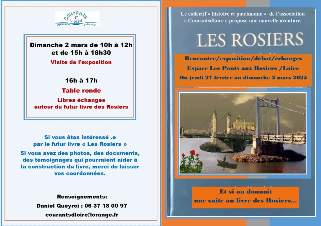 Daniel Queyroi et l’association culturelle Courantsdloire travaillent à faire revivre l’histoire de ce collectif de passionnés qui ont donné vie à ce livre sorti en 2001.Du jeudi 27 février au dimanche 2 mars Daniel Queyroi retracera l’histoire du livre avec une exposition de ce travail de 10 ans autour du livre. Cyrille Piron a été invité à rejoindre le collectif et a travaillé autour de cartes postales sur les Rosiers, autrefois et aujourd’hui, via sa page Facebook. Nous le remercions. Emmanuel Brouard, historien et auteur de livres sur l’Anjou et la Loire interviendra le samedi sous forme de dialogue et d’échanges avec le public. Nous vous attendons nombreux. Daniel Queyroi et les benevoles de l’association Courantsdloire seront ravis de vous accueillir.