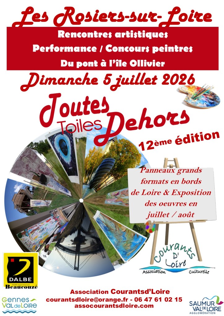 Mesdames, Messieurs les artistes, l’association culturelle Courantsdloire prépare la 12ème édition de l’événement « ToutesToiles Dehors » qui se déroule aux Rosiers-sur-Loire à l’île ollivier en bord de Loire. Elle est prévue le Dimanche 5 juillet 2026.